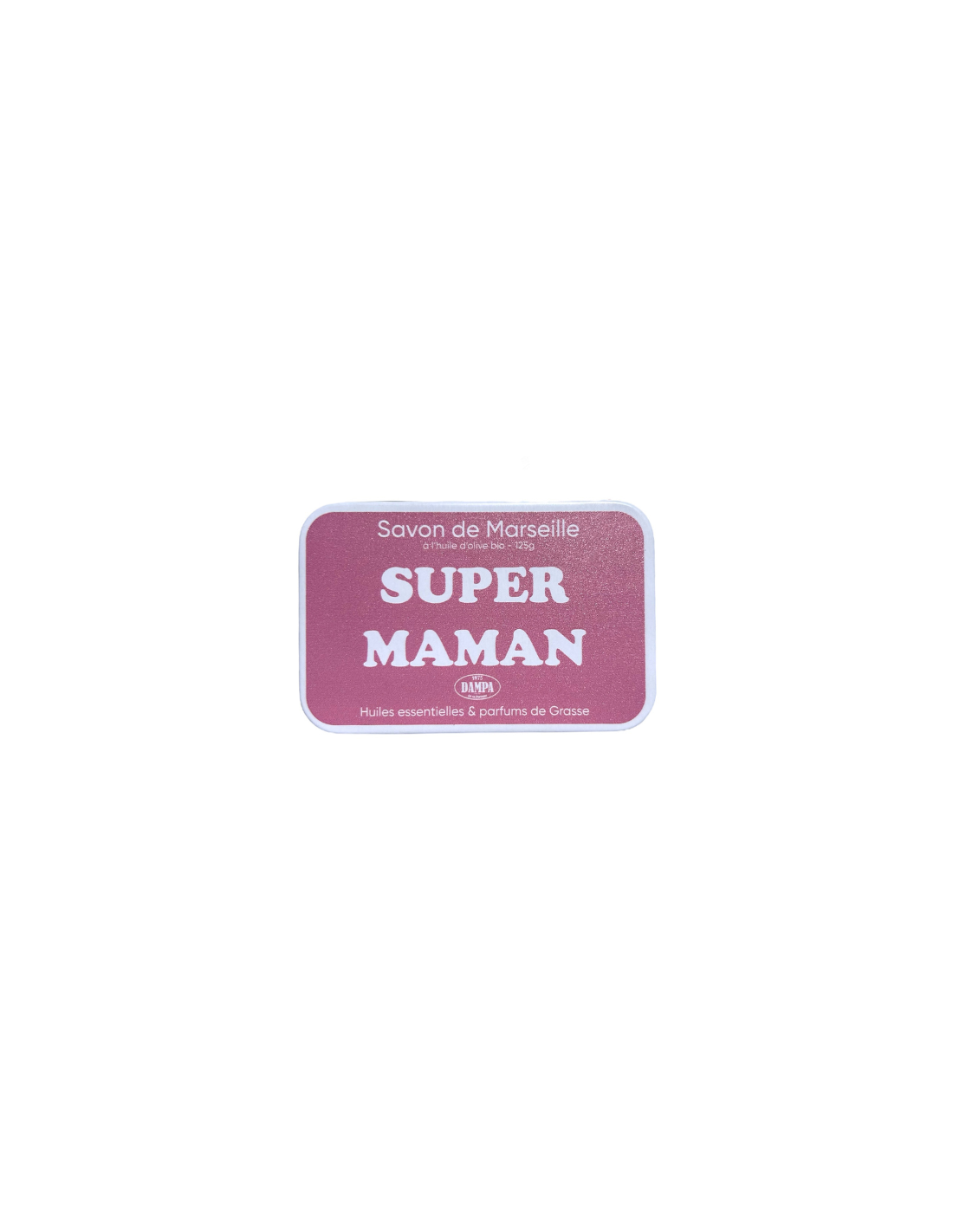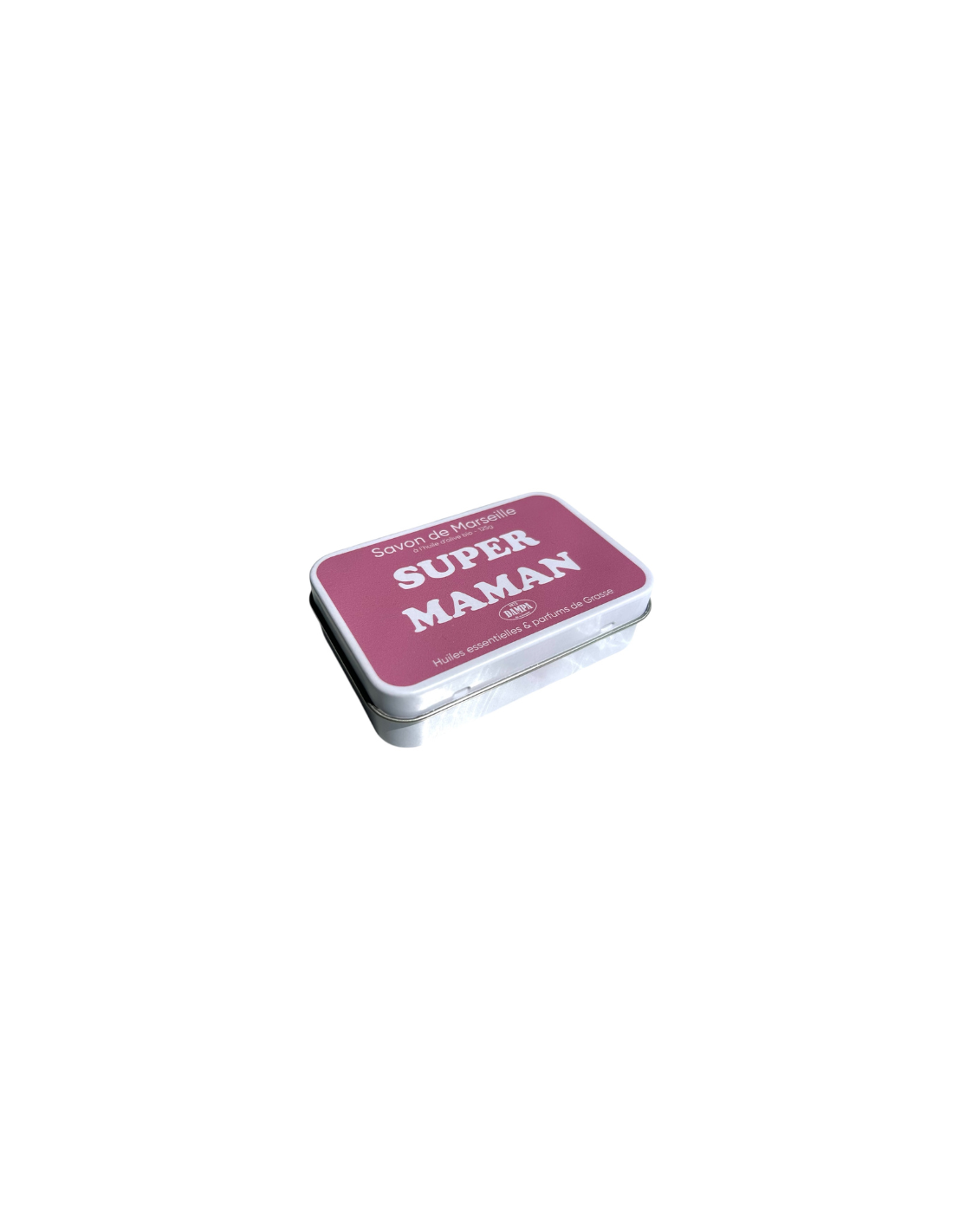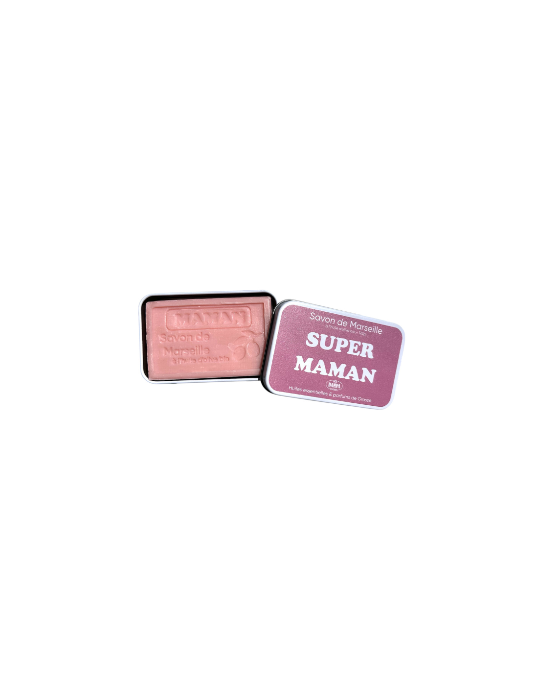 Etui en métal "Super Maman" avec son savon de Marseille "Maman" 125 gr. aux huiles végétales et huile d 'olive bio. Parfum : ambre. Fabriqué en France (13) artisanalement.